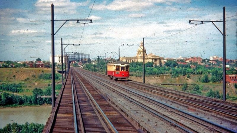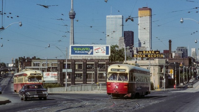 Toronto Queen Street at the Don River with two post-war PCC cars. Photo by Ted Wickson.